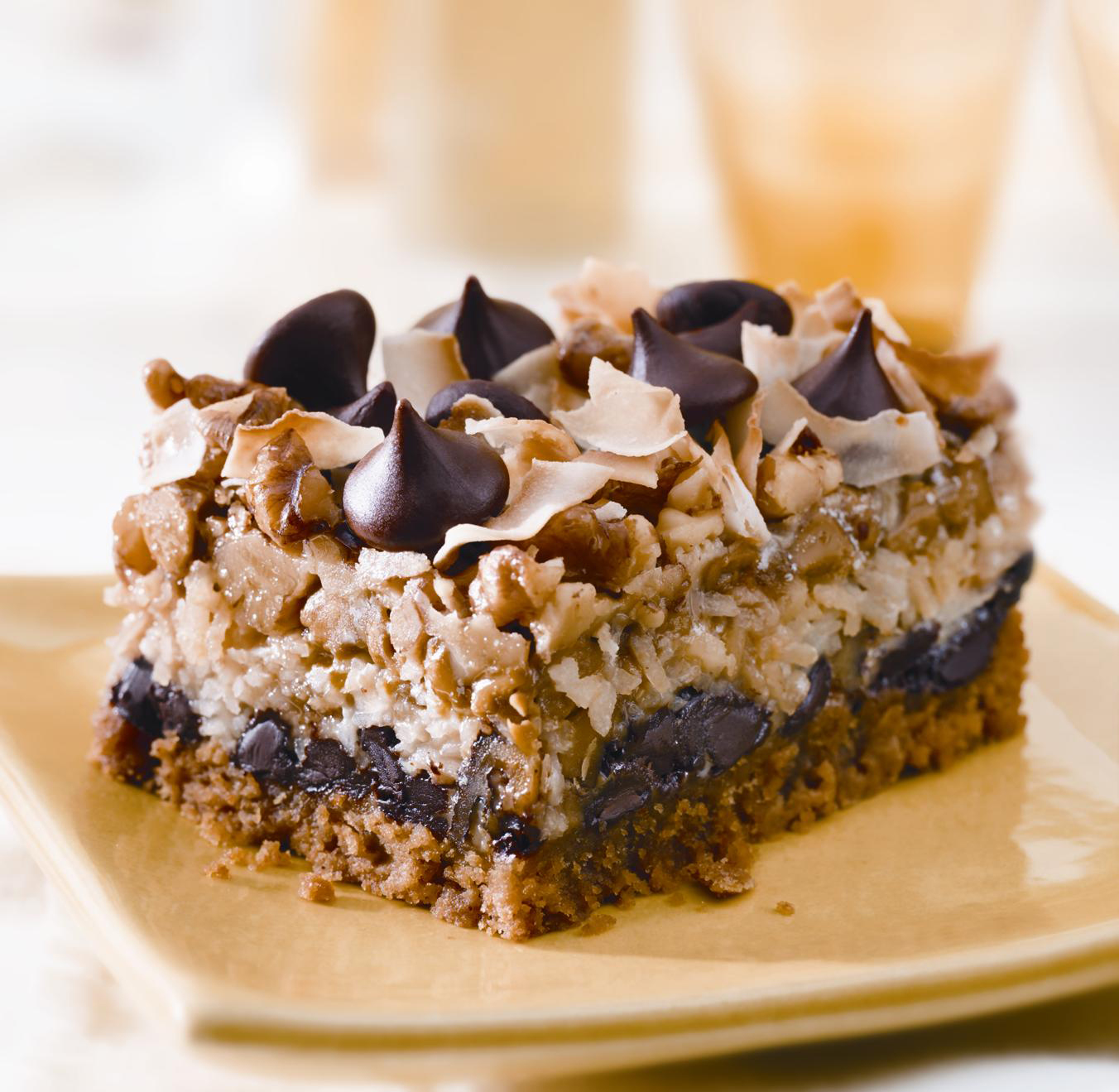 Syv lag av mørk og lys sjokolade, spredt med karamell, kokos og valnøtter. Ferdig oppdelt i 9 stykker.