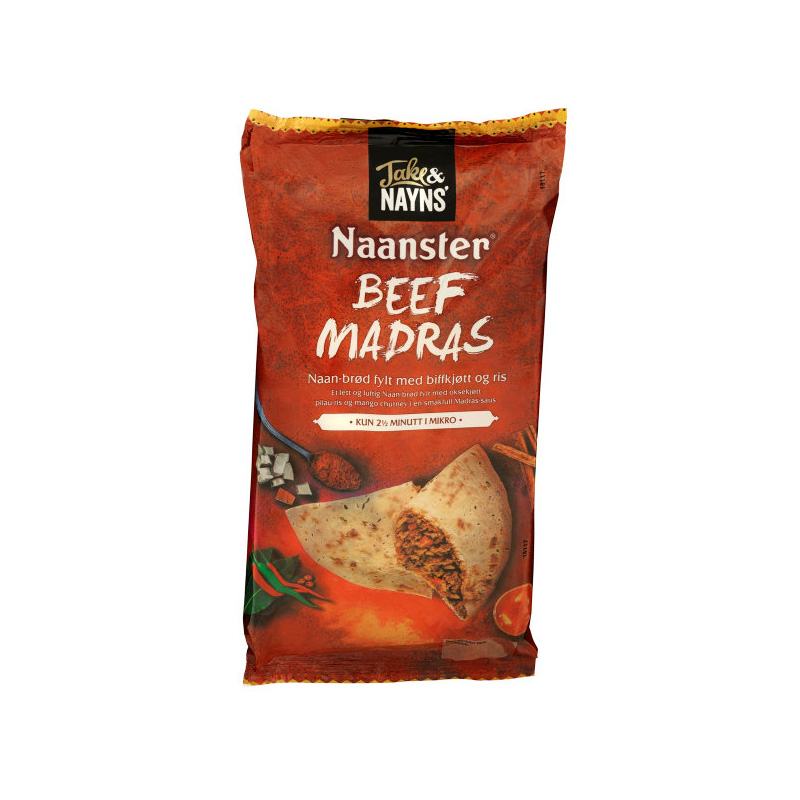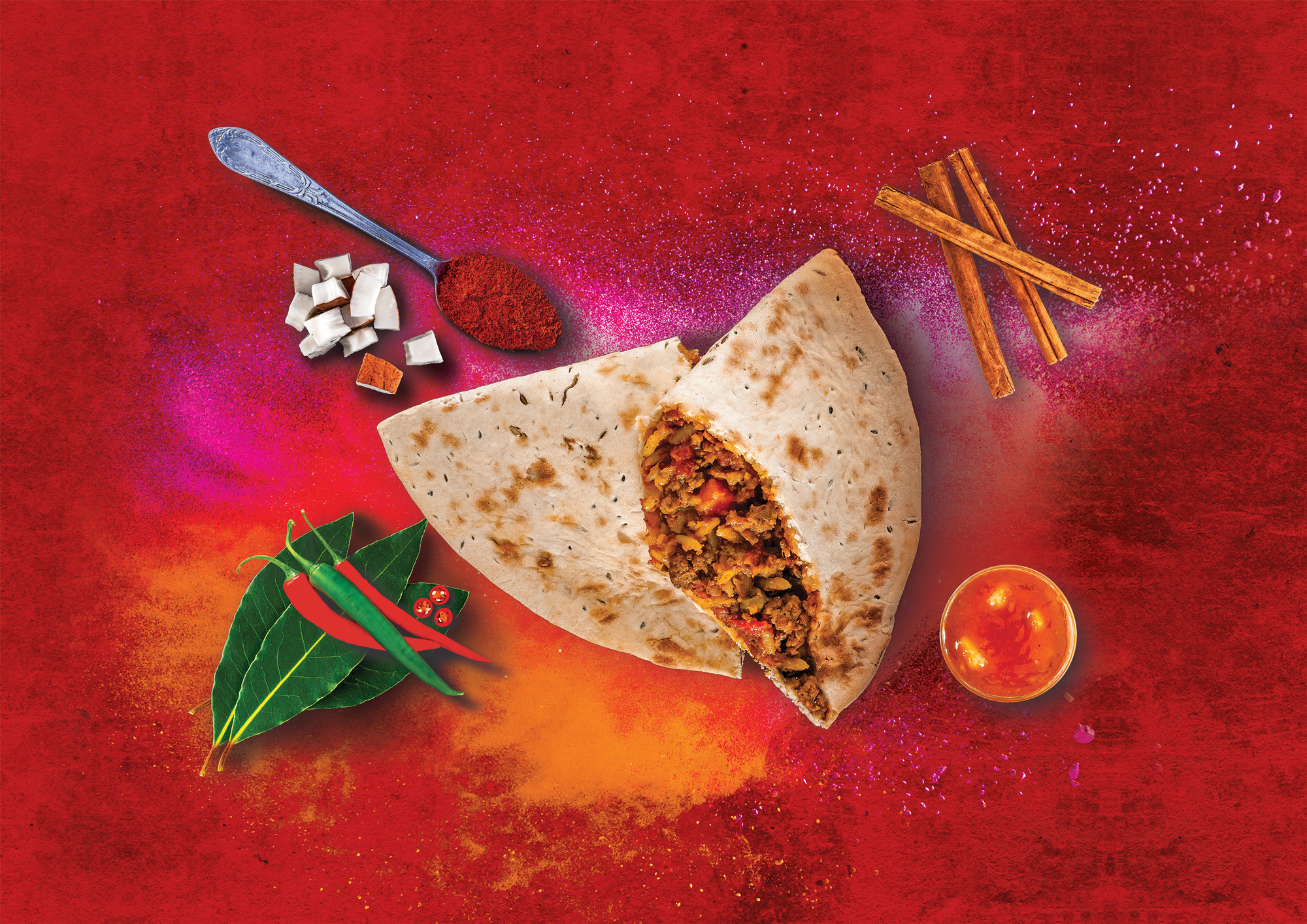 Fylt naan-brød med marinert biffkjøtt, pilau-ris og mango chutney i Madras-saus.