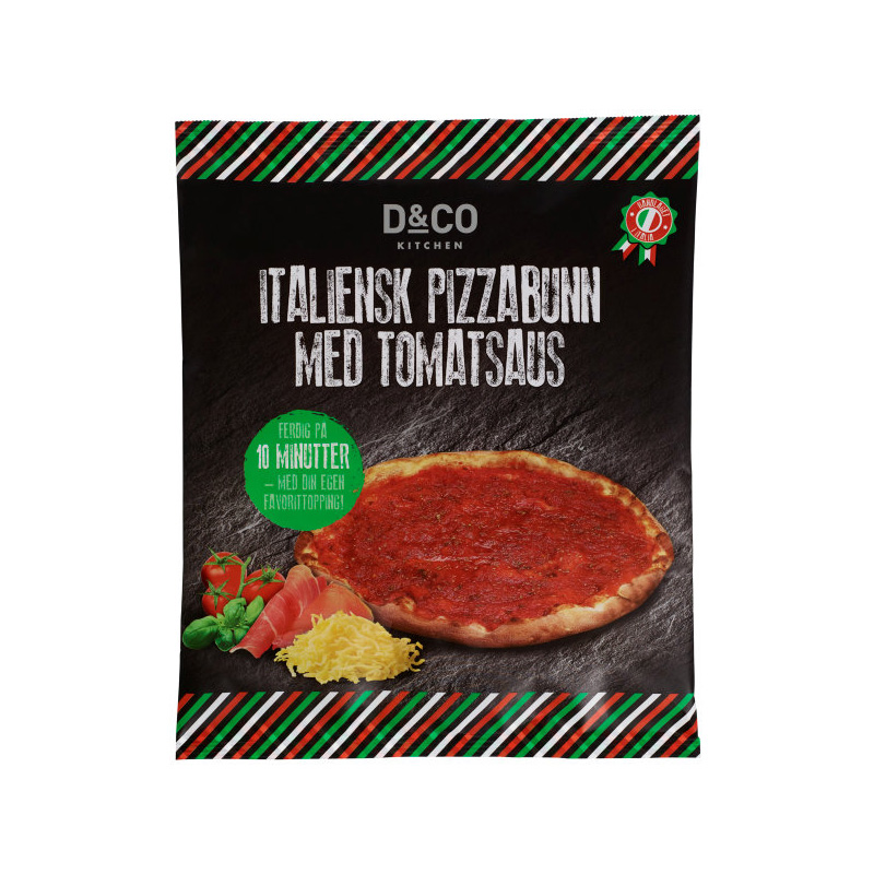 Tynn, luftig pizzabunn på 26 cm, toppet med fyldig tomatsaus.