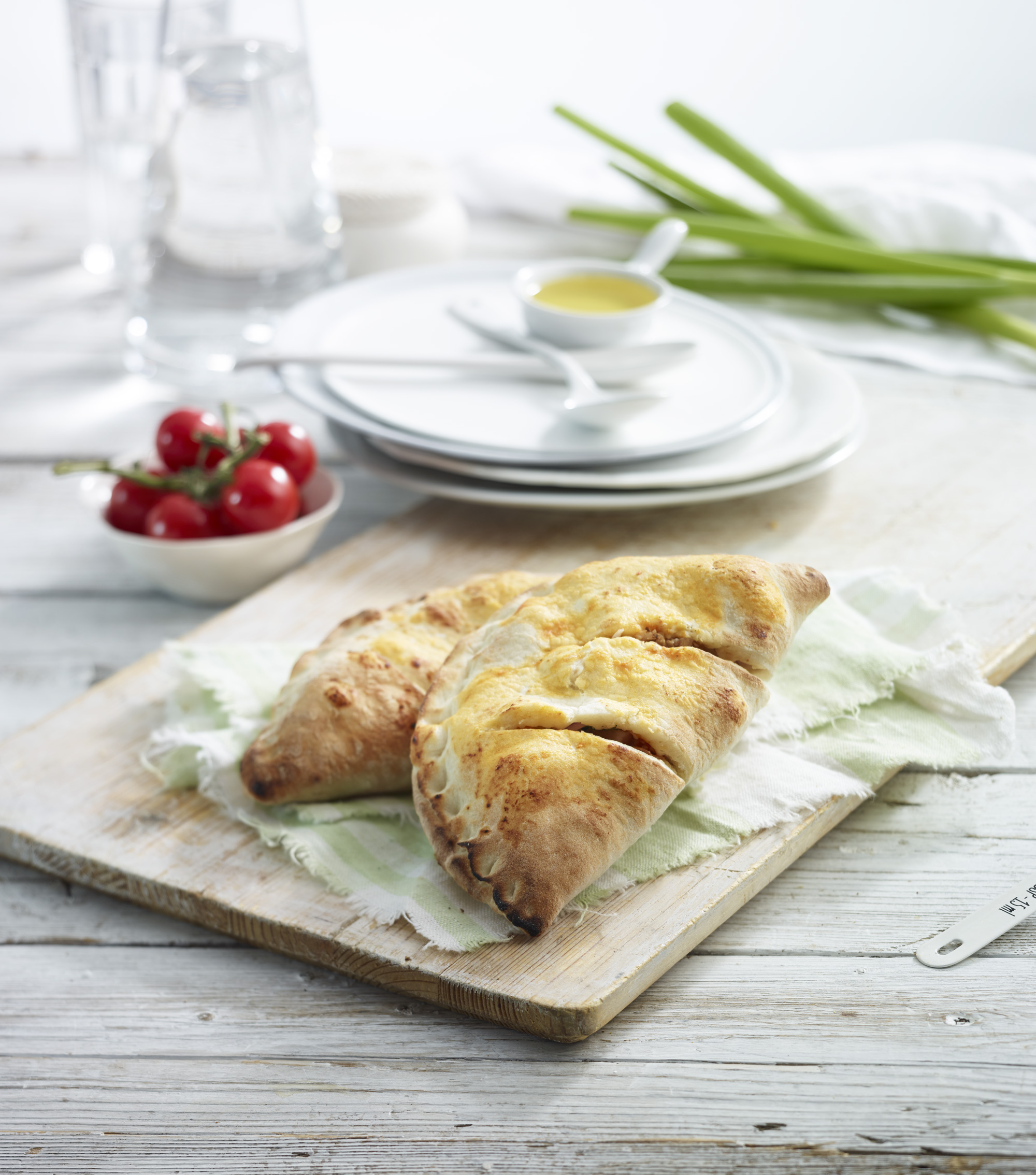 A hand folded Calzone filled with a classic combination of ham, mozzarella and a delicious tomato sauce.