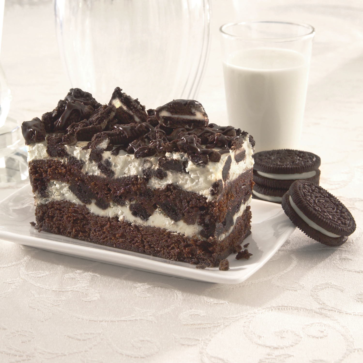 Brownie with white and dark chocolate, garnished with Oreo Cookies®. Precut to 12 slices.