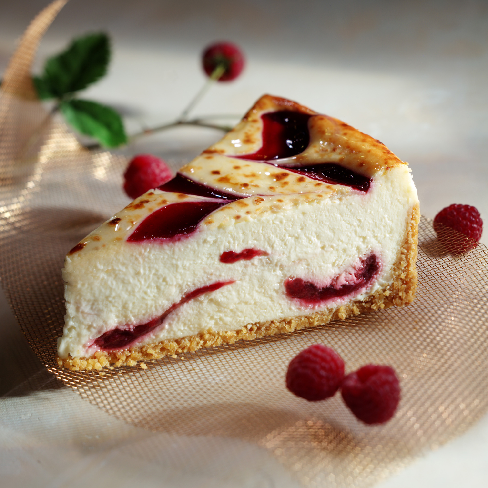 A delicate cheesecake combined with white chocolate and raspberries. Precut to 16 slices.