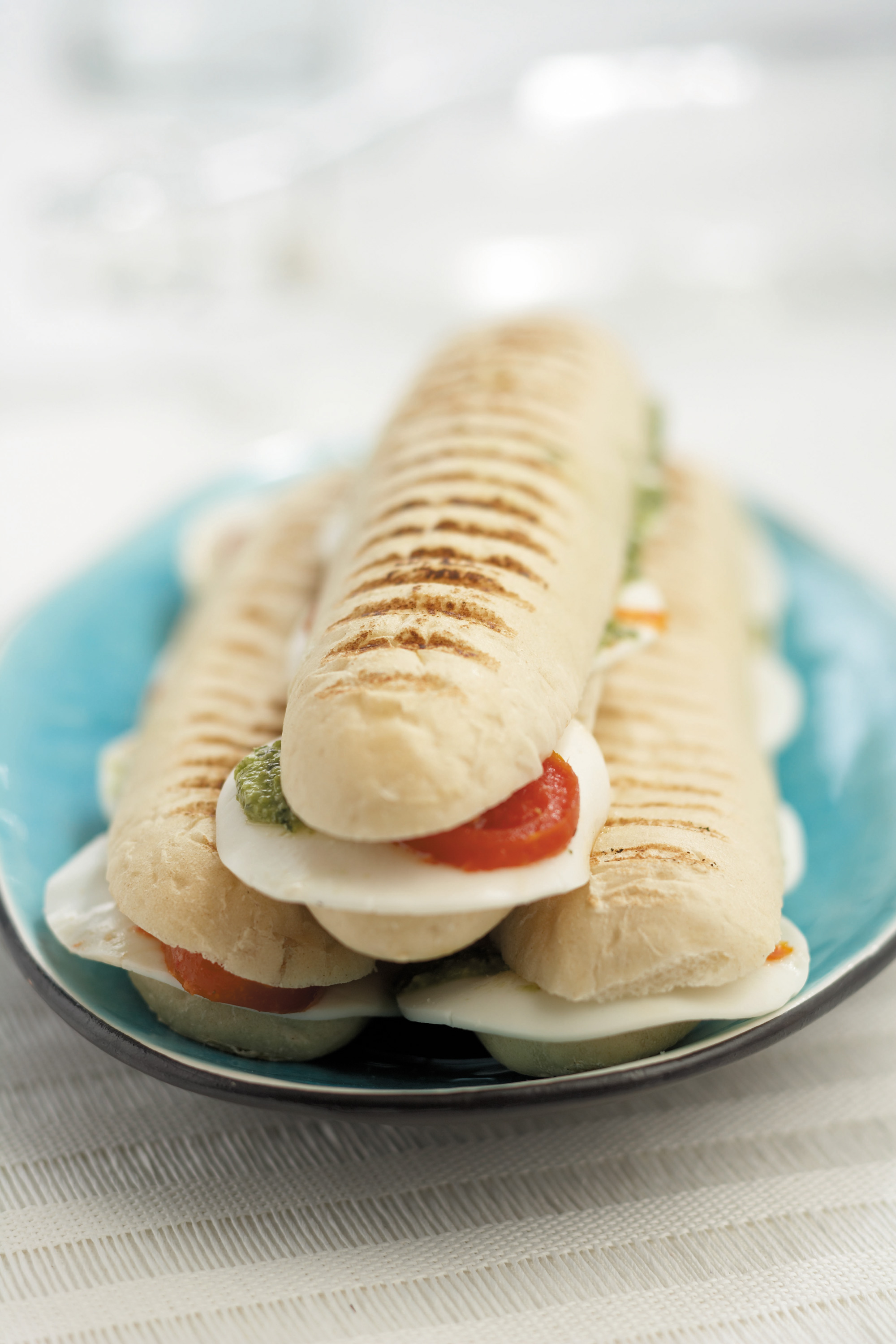Klassisk panini med grillränder, fylld med mozzarella, soltorkade tomater och en välsmakande pesto.