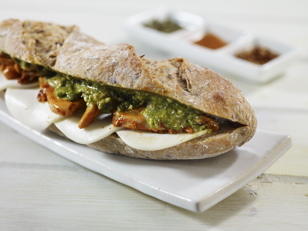 Rustikt bröd fylld med marinerad kyckling, ost och en välsmakande pesto. Hög halt av korn ger ett saftigt och tålig bakverk med massor av smak.