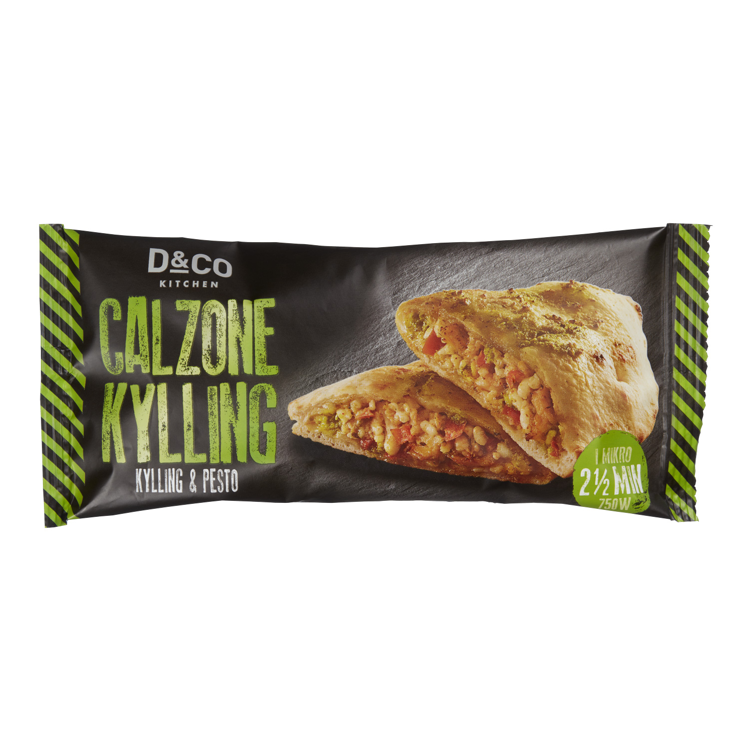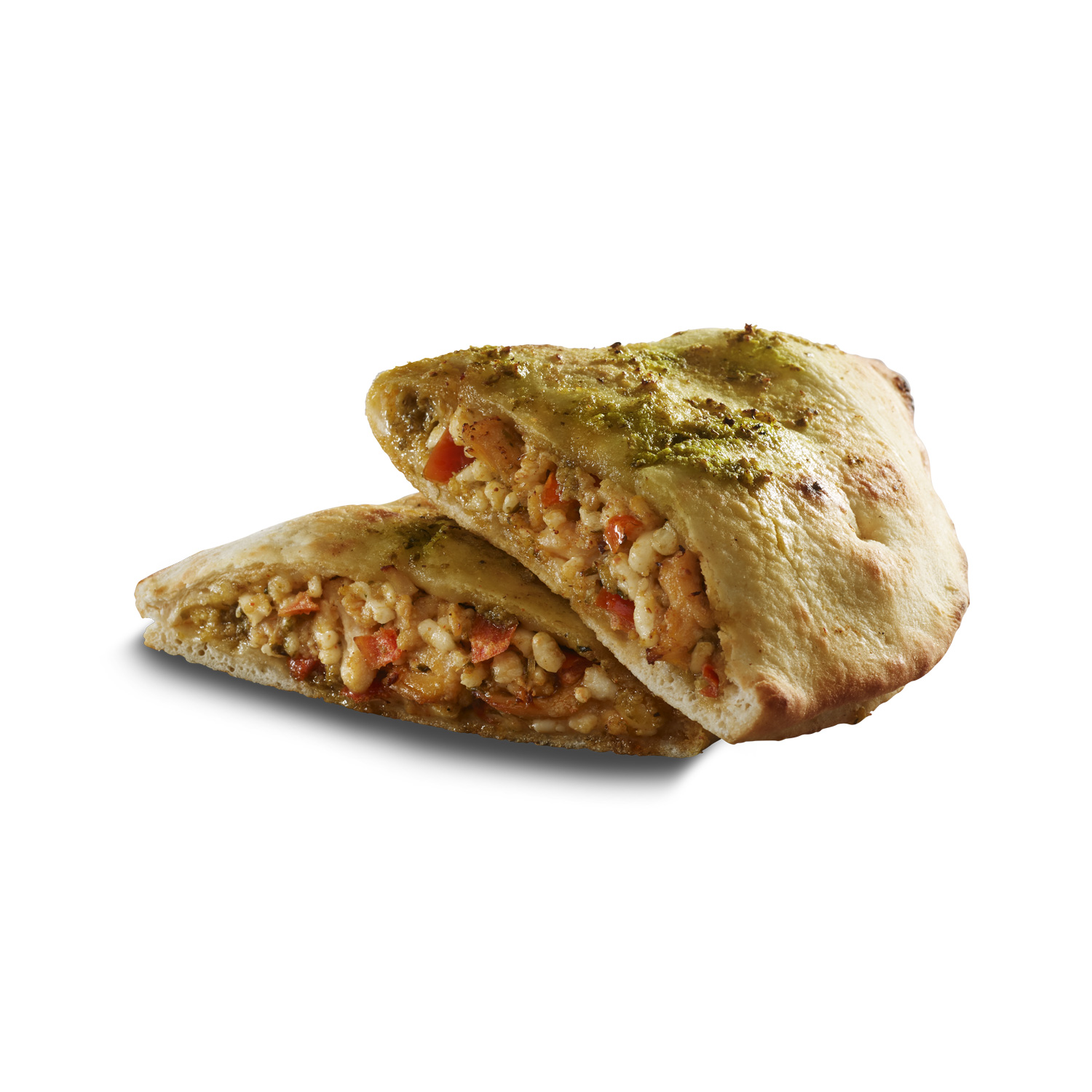 Håndlaget calzone fylt med marinert kyllingbryst, ost og smakfull pesto.