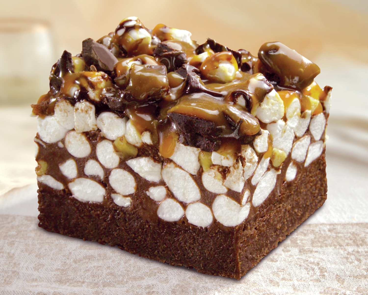 Brownie med mørk sjokolade, marshmallow og honninglaserte valnøtter. Ferdig oppdelt i 9 stykker.