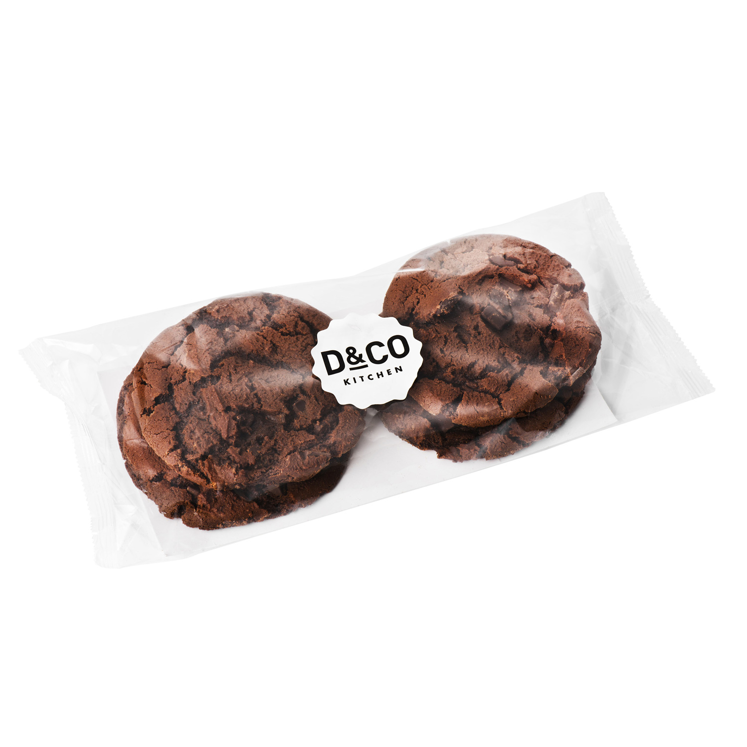Stor amerikansk cookie som er myk i midten og full av biter med mørk sjokolade.