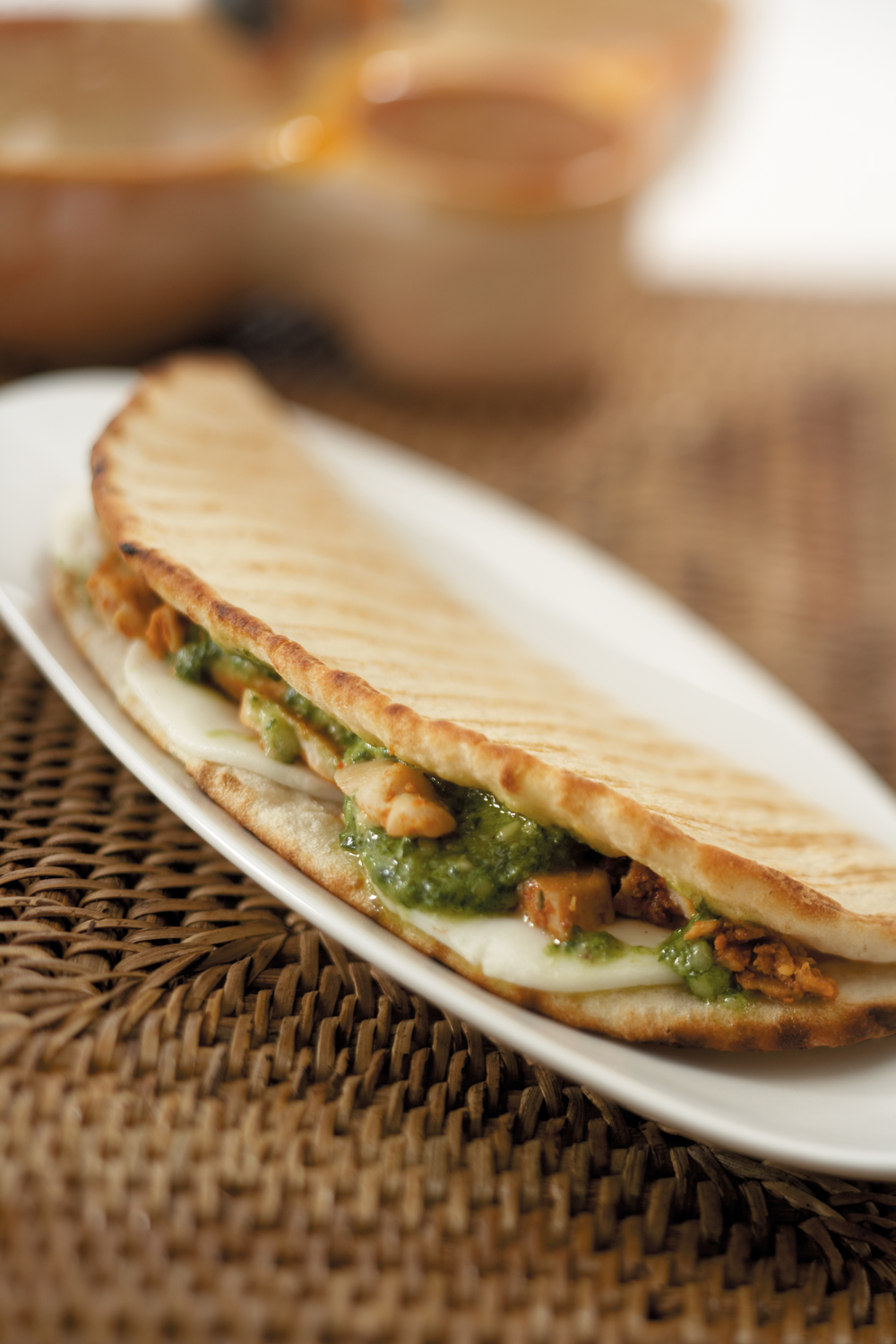 Tynn, rustikk fullkornsdeig fylt med marinert kyllingbryst, ost og smakfull pesto.