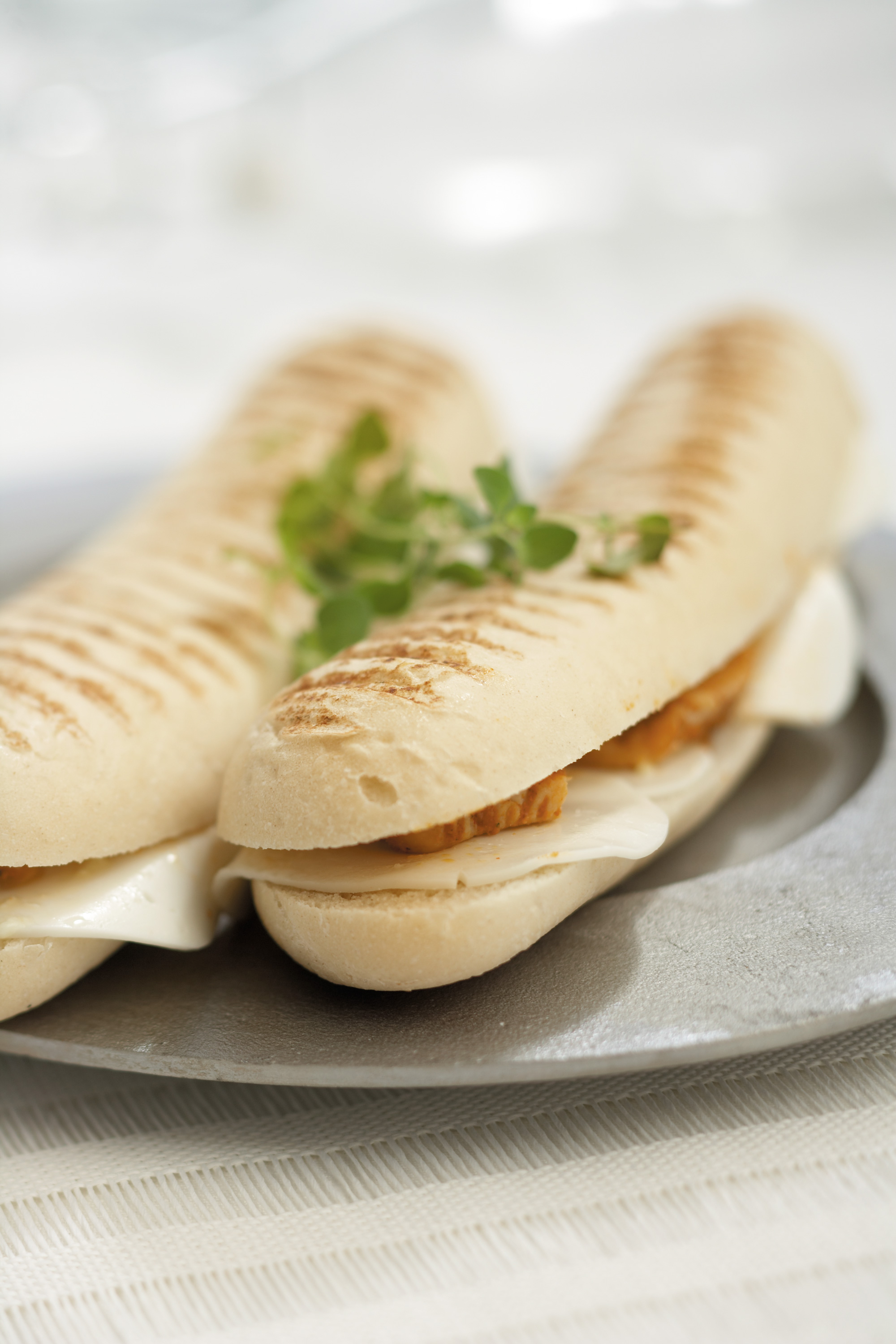 Grov panini med grillstriper, fylt med marinert kyllingbryst og ost.