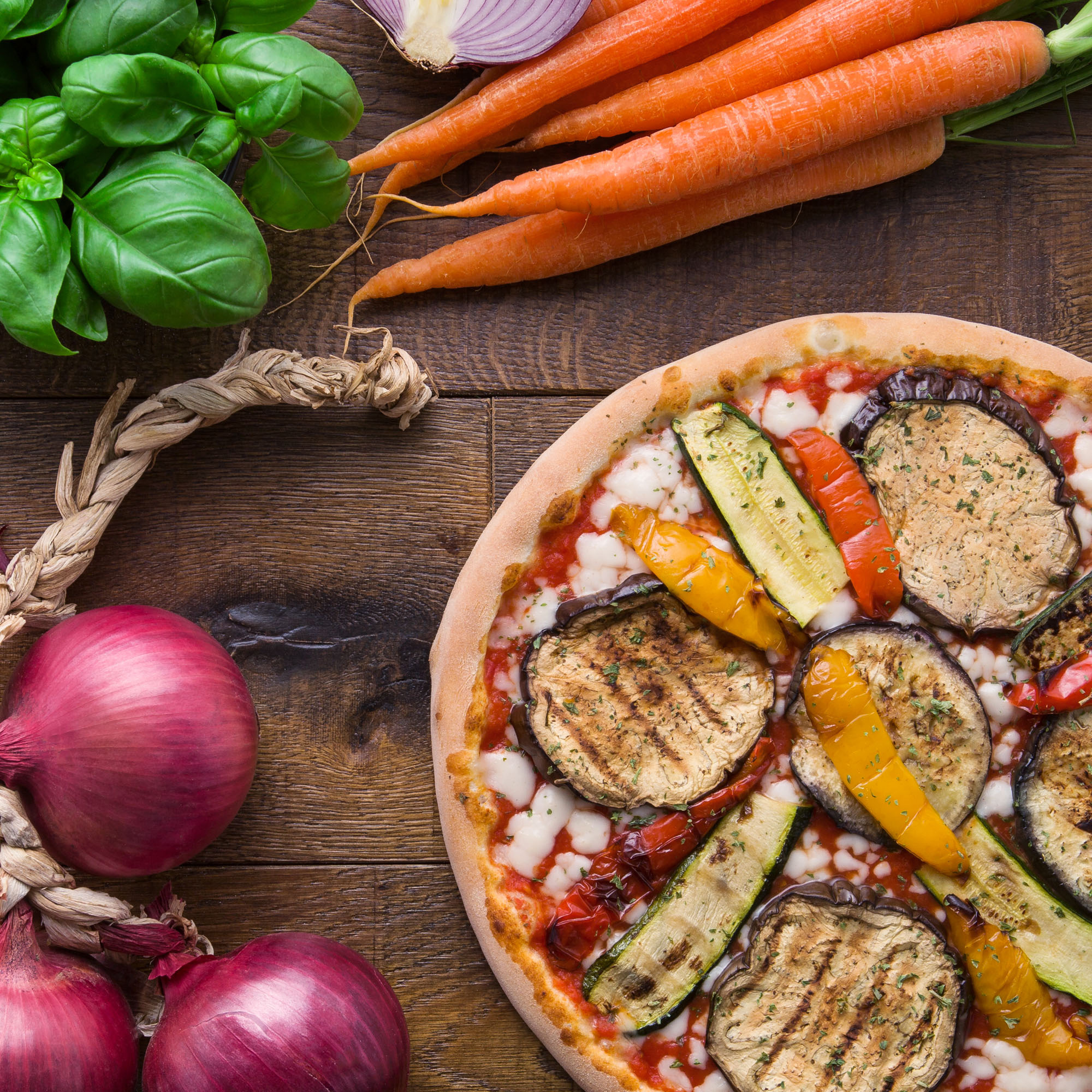 Luftig, vegansk pizza med ris-basert topping, grillede grønnsaker og tomater.