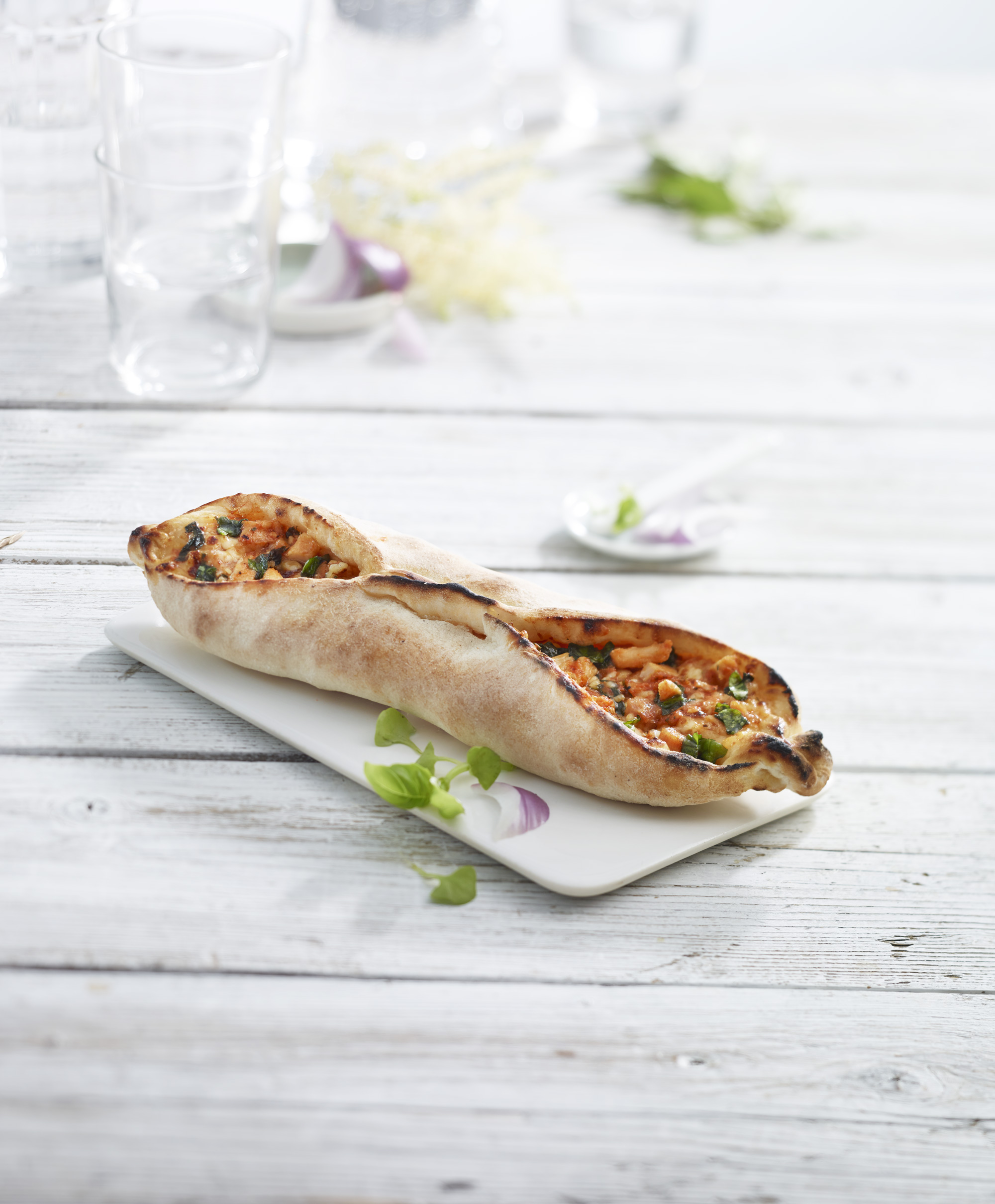 Tynn, rustikk deig fylt med marinert kyllingbryst, tomater og smakfull pesto.