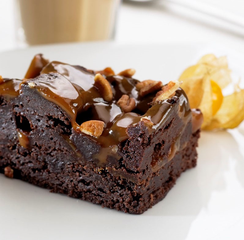 Brownie med myk karamell, pecannøtter og melkesjokolade. Ferdig oppdelt i 16 stykker.