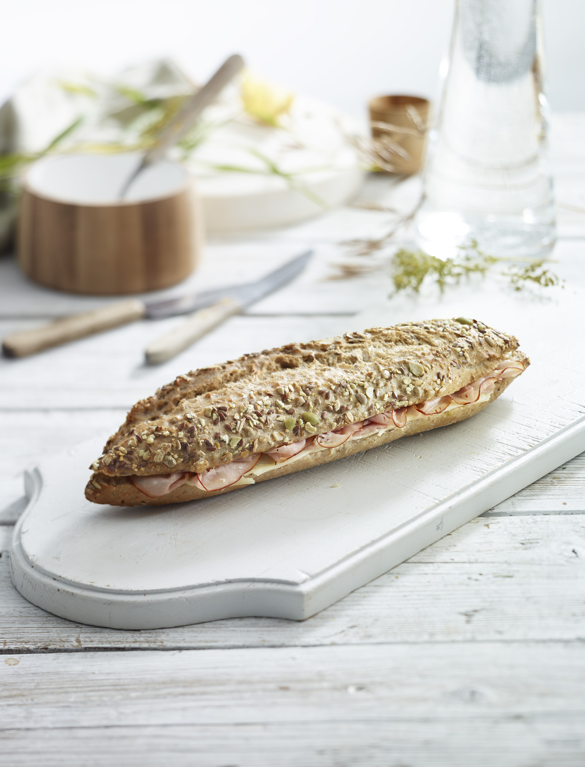 Rustikt brød fylt med fylt med røkt skinke, edamerost og en pikant dijonese-saus. Høyt innhold av hele frø og korn gir et saftig og holdbart bakverk med mye smak.