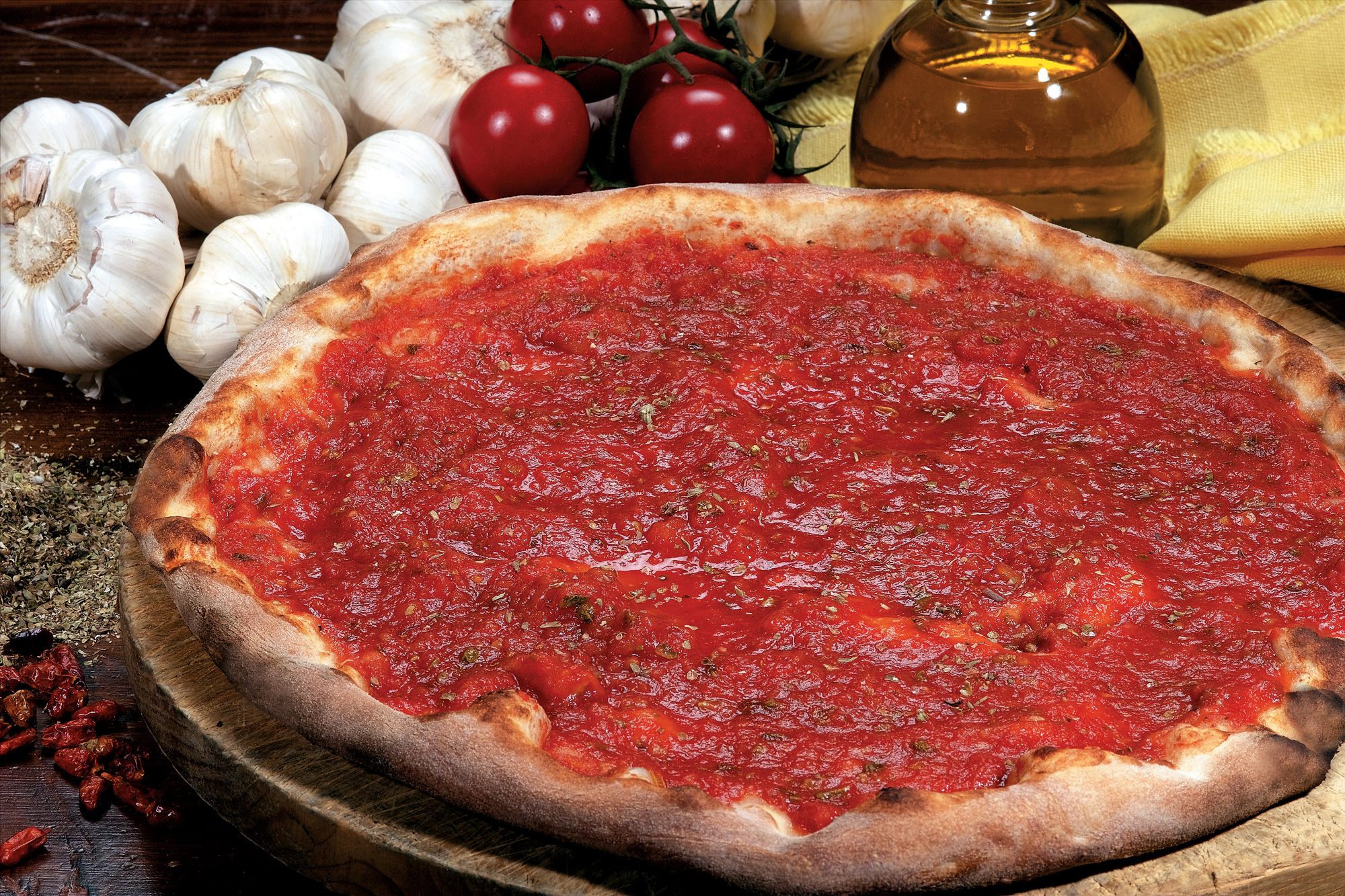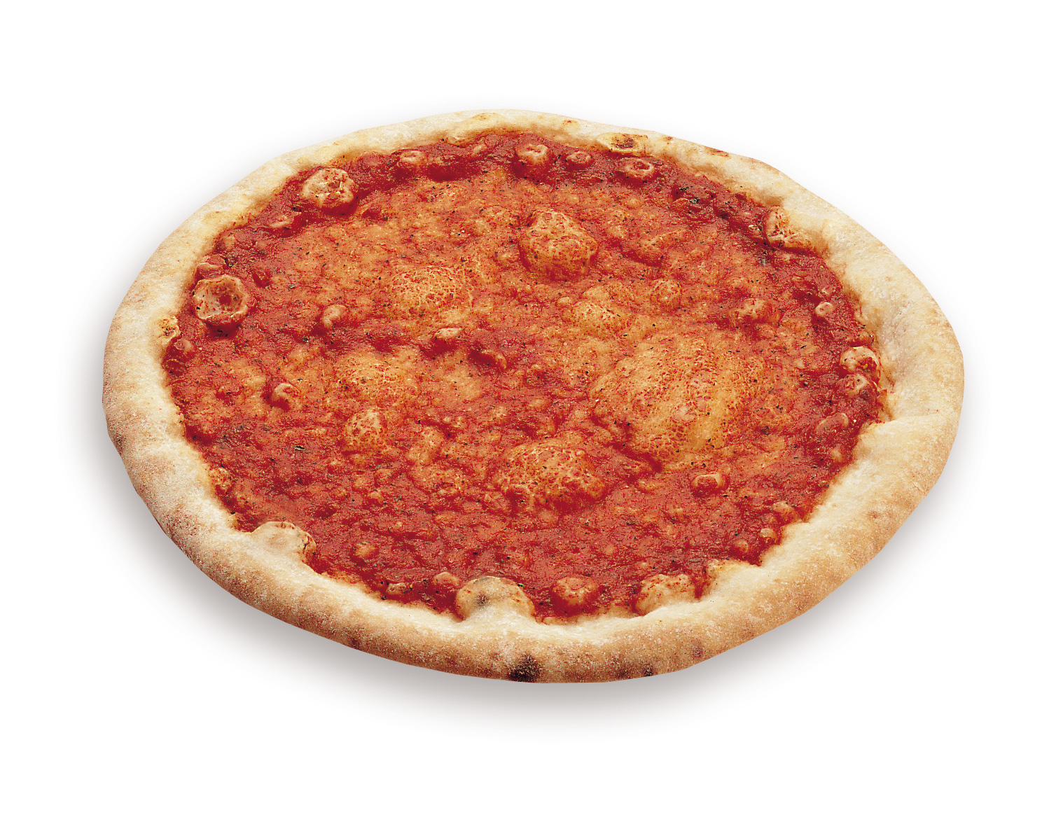 Tynn, luftig pizzabunn på 30 cm, toppet med fyldig tomatsaus.