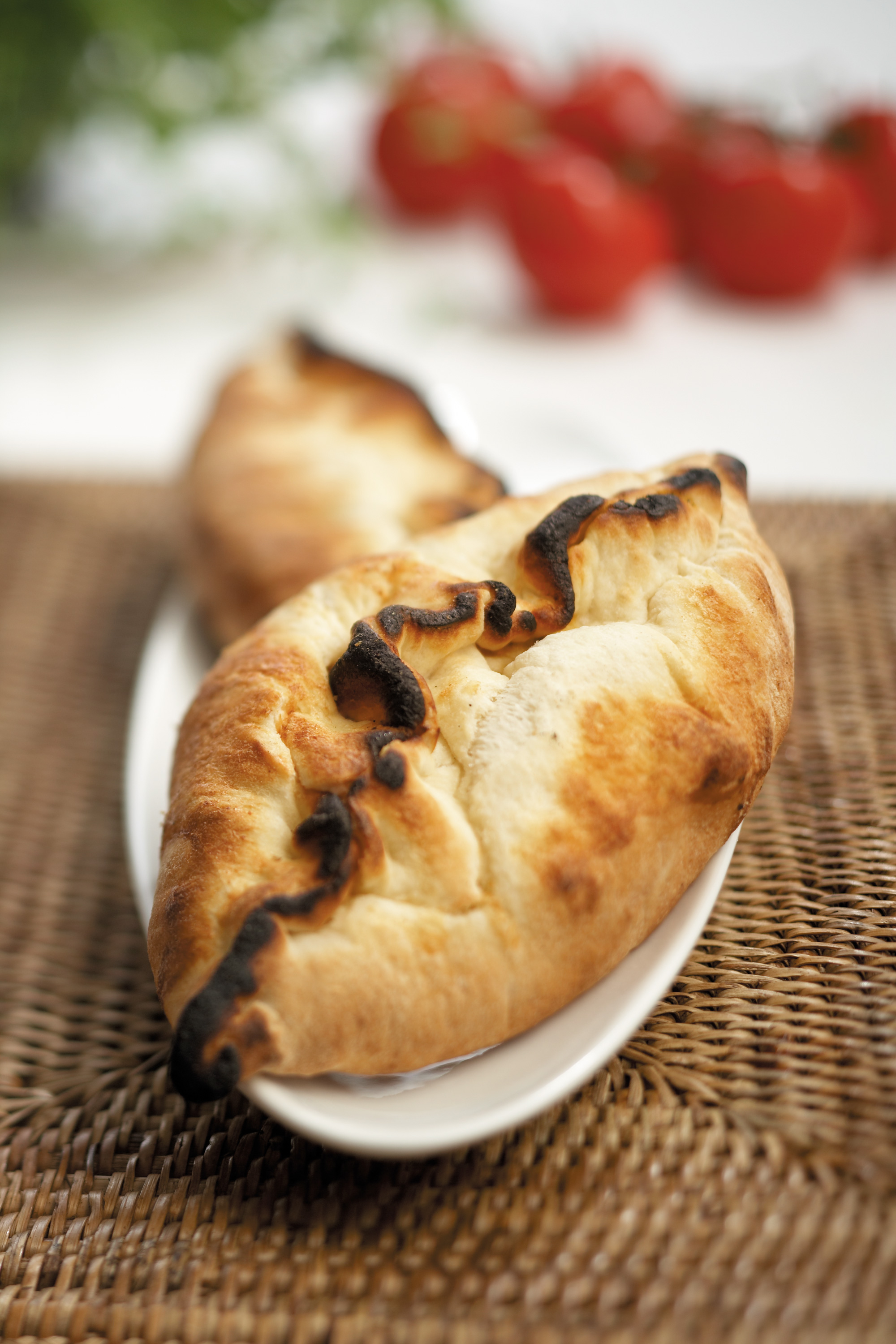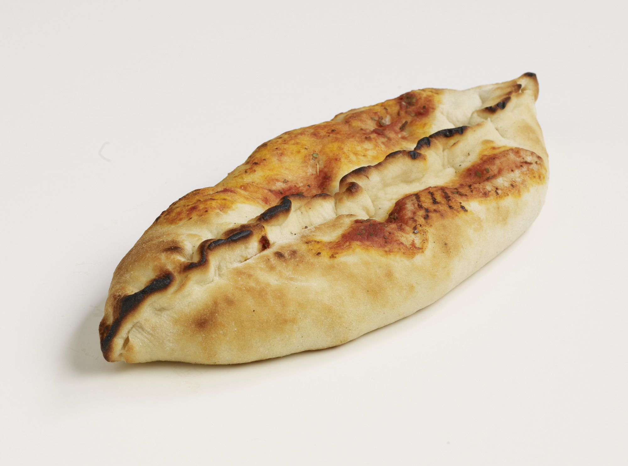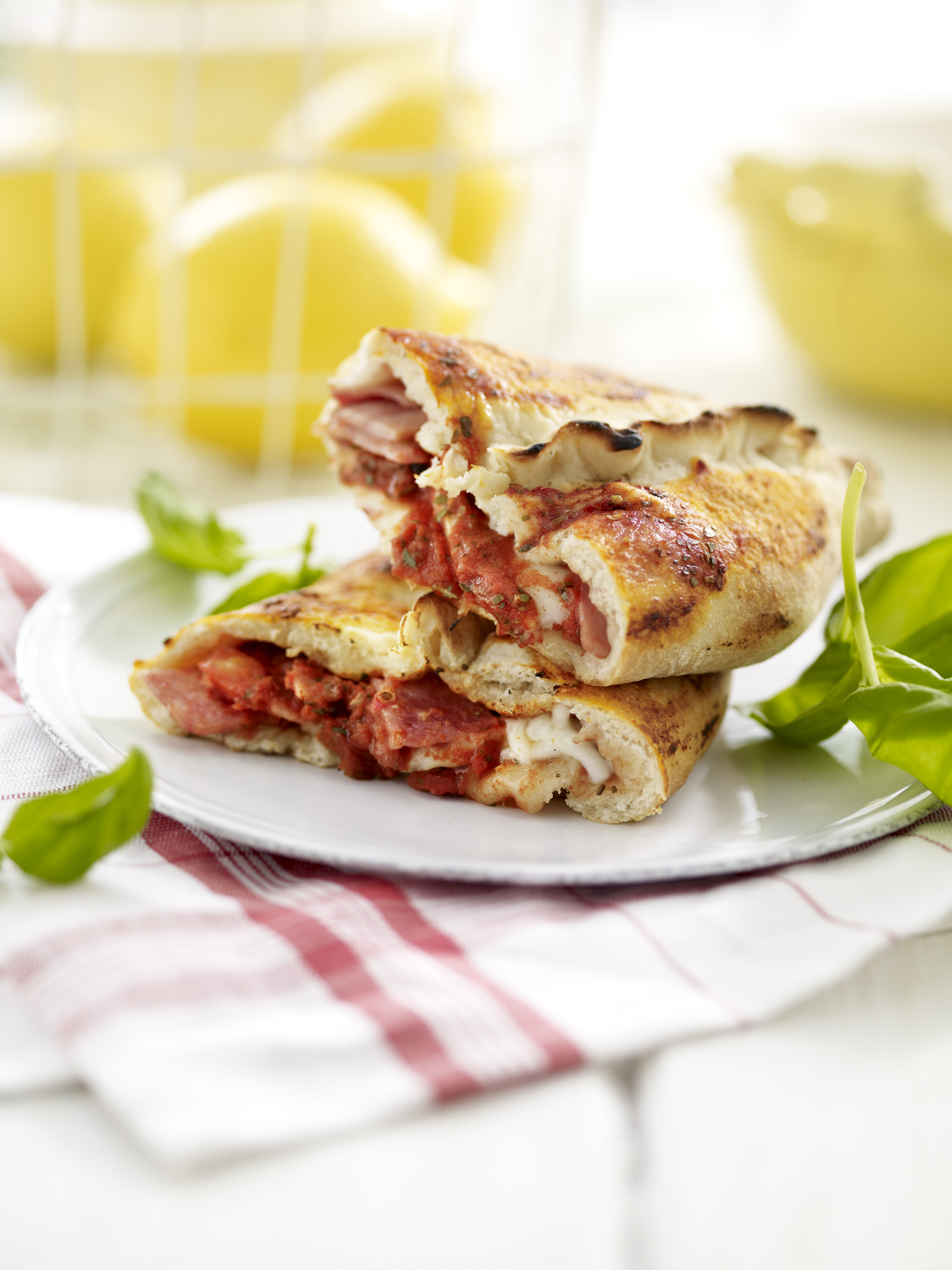 Handgjord calzone fylld med skinka, mozzarella och en smakrik tomatsås. Calzonen har ett rustikt utseende och en helt unik smak och aroma. Beställningsvara – Kontakta oss vid intresse.
