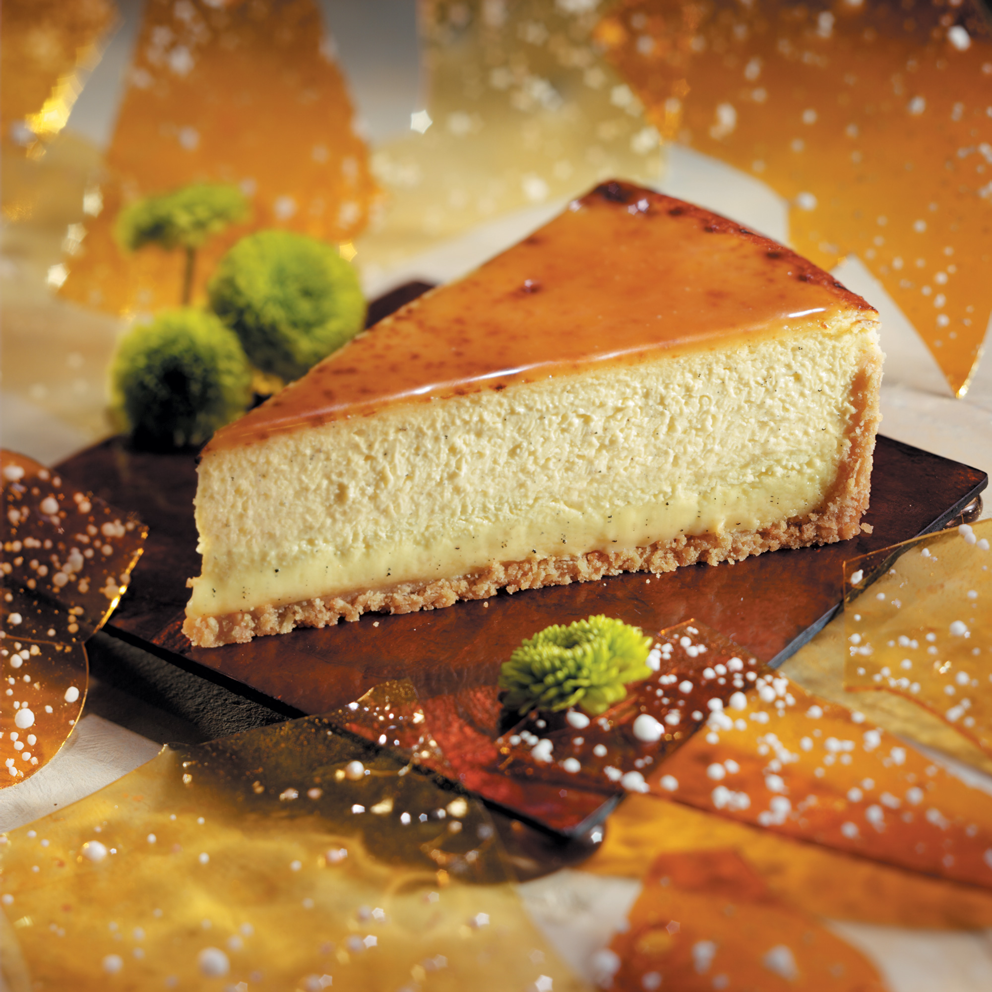 En mjuk osttårta med creme bruleê och karamelliserad topping. Oppdelad i 14 delar.