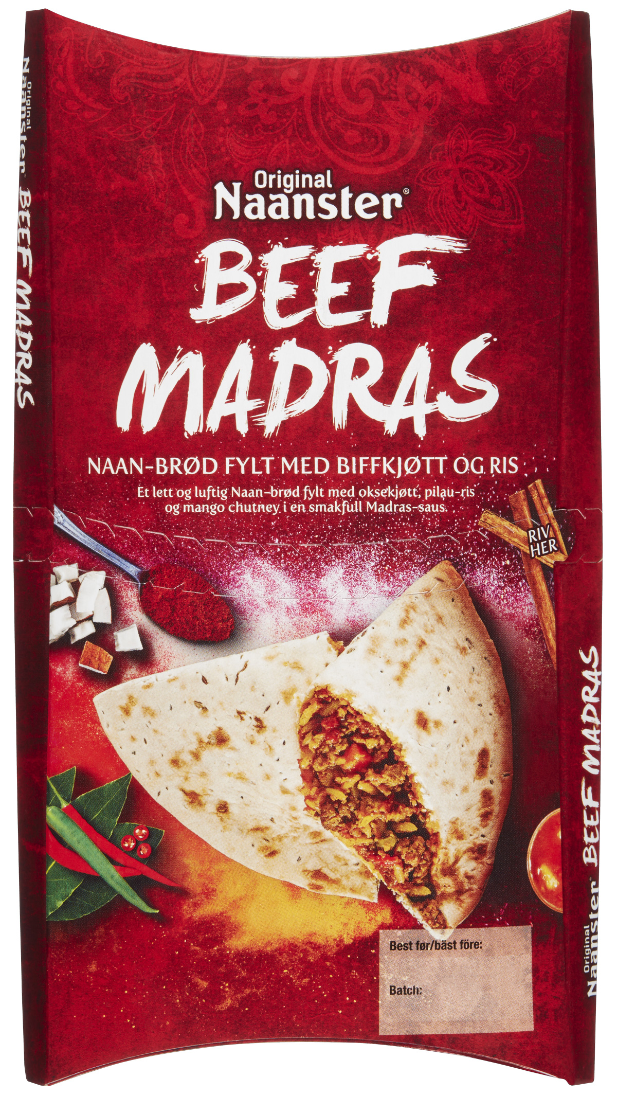 Fylld naan-bröd med marinerad nötkött, pilau ris och mango chutney i Madras-sås. Beställningsvara – Kontakta oss vid intresse.