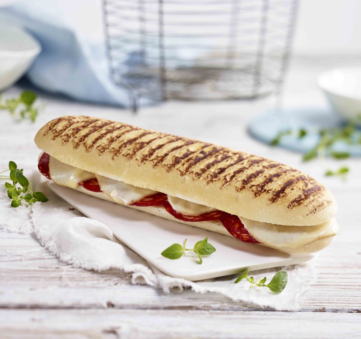 Klassisk panini med grillränder, fylld med kryddig salami, rökt ost och toppad med Tabasco.