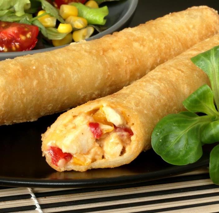 Friterad rulle med kyckling, bönor, majs och ris. Beställningsvara – Kontakta oss vid intresse.